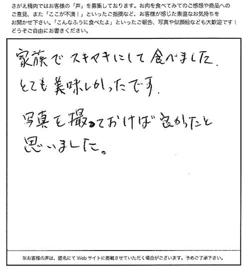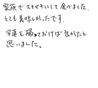 家族でスキヤキにして食べました。 とても美味しかったです。 写真を撮っておけば良かったと思いました。