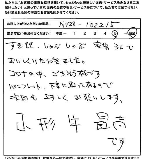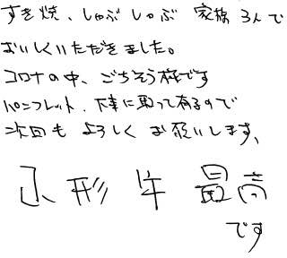 すき焼き、しゃぶしゃぶ、家族3人でおいしくいただきました。コロナの中、ごちそう様です。パンフレット、大事に取って有るので次回もよろしくお願いします。山形牛最高です。