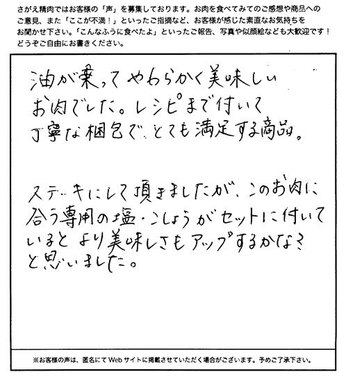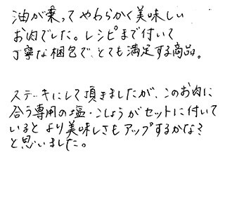 油が乗ってやわらかく美味しいお肉でした。レシピまで付いて丁寧な梱包で、とても満足する商品。ステーキにして頂きましたが、このお肉に合う専用の塩・こしょうがセットに付いているとより美味しさもアップするかな?と思いました。
