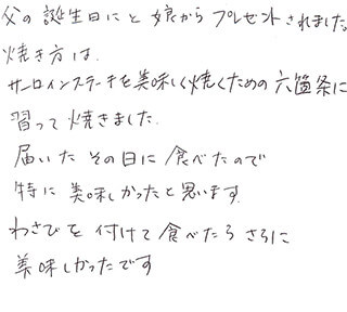 父の誕生日にと娘からプレゼントされました。焼き方は、サーロインステーキを美味しく焼くための六箇条に習って焼きました。届いたその日に食べたので特に美味しかったと思います。わさびを付けて食べたらさらに美味しかったです