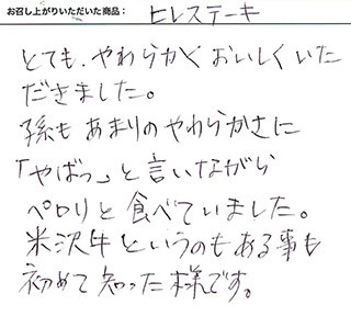 いただいてから食べ終わるまでとても幸せな時間をありがとうございました【米沢牛/ステーキ 極上ヒレ/結婚祝い】