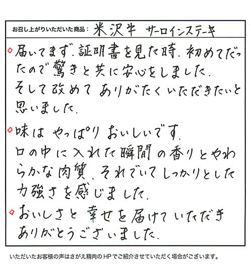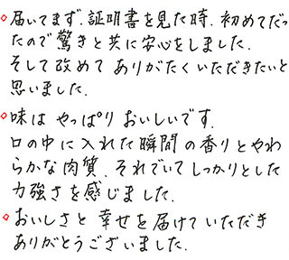 ◇届いてまず、証明書を見た時、初めてだったので驚きと共に安心をしました。そして改めてありがたくいただきたいと思いました。◇味はやっぱりおいしいです。口の中に入れた瞬間の香りとやわらかな肉質、それでいてしっかりとした力強さを感じました。◇おいしさと幸せを届けていただきありがとうございました。
