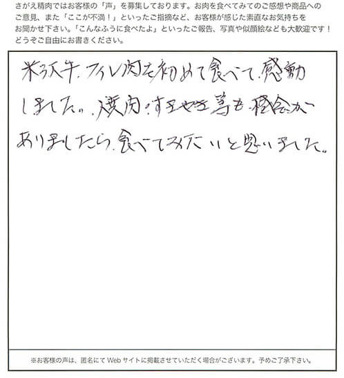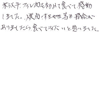 米沢牛、フィレ肉を初めて食べて、感動しました。焼肉・すきやき等も機会がありましたら食べてみたいと思いました。