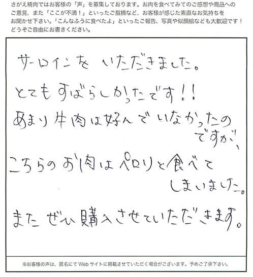 サーロインをいただきました。とてもすばらしかったです!!あまり牛肉は好んでいなかったのですが、こちらのお肉はペロリと食べてしまいました。またぜひ購入させていただきます。