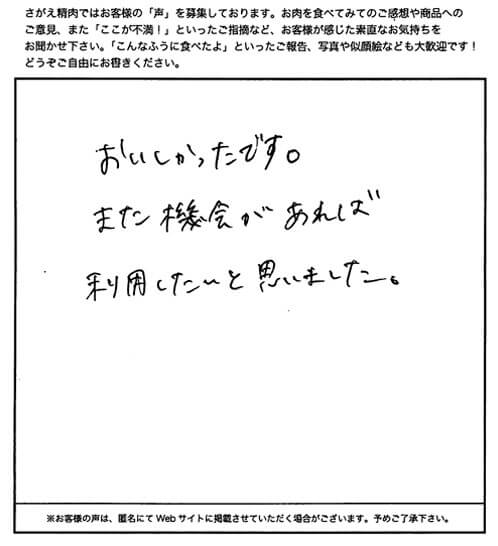 お客さまの声や口コミ・レビューをご紹介いたします。お寄せいただいた温かいお言葉を励みに、もっと、もっと、ご満足いただけるお肉をご提供できるよう努めてまいります。