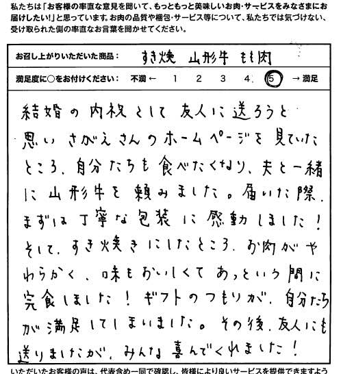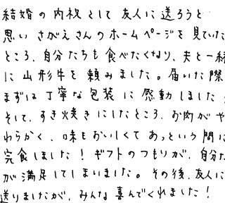 結婚の内祝として友人に送ろうと思いさがえさんのホームページを見ていたところ、自分たちも食べたくなり、夫と一緒に山形牛を頼みました。届いた際、まずは丁寧な包装に感動しました!そして、すき焼きにしたところ、お肉がやわらかく、味もおいしくてあっという間に完食しました!ギフトのつもりが、自分たちが満足してしまいました。その後、友人にも送りましたが、みんな喜んでくれました!