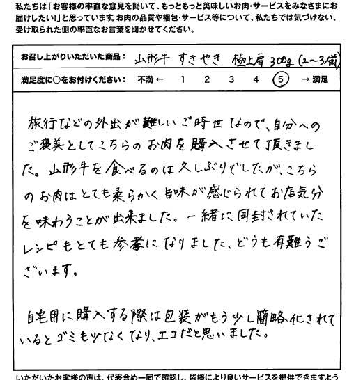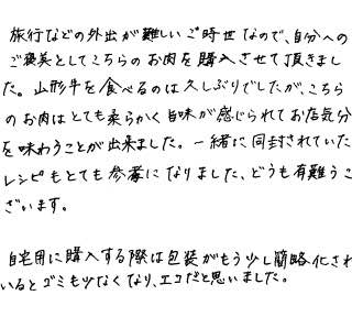 旅行などの外出が難しいご時世なので、自分へのご褒美としてこちらのお肉を購入させて頂きました。山形牛を食べるのは久しぶりでしたが、こちらのお肉はとても柔らかく旨味が感じられてお店気分を味わうことが出来ました。一緒に同封されていたレシピもとても参考になりました。どうも有難うございます。自分用に購入する際は包装がもう少し簡略化されているとゴミも少なくなり、エコだと思いました。
