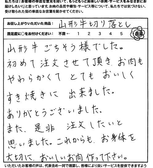 山形牛ごちそうさまでした。初めて注文させて頂き、お肉も柔らかくてとてもおいしくすき焼きに出来ました。ありがとうございました。また是非注文したいと思いました。これからもお身体を大切に、おいしいお肉作ってください。