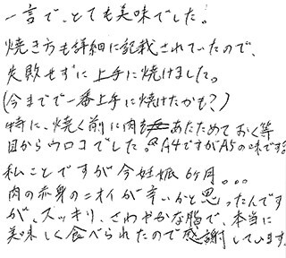 一言で、とても美味でした。 焼き方も詳細に記載されていたので、失敗せずに上手に焼けました。 (今までで一番上手に焼けたかも?) 特に、焼く前に肉をあたためておく等目からウロコでした! A4ですがA5の味です! 私ことですが今妊娠6ヶ月… 肉の赤身のニオイが辛いかと思ったんですが、スッキリさわやかな脂で、本当に美味しく食べられたので感謝しています。