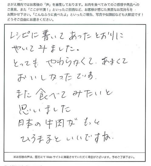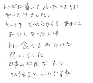 レシピに書いてあったとおりにやってみました。 とってもやわらかくてあまくておいしかったです。 また食べてみたいと思いました。 日本の牛肉がもっとひろまるといいですね。