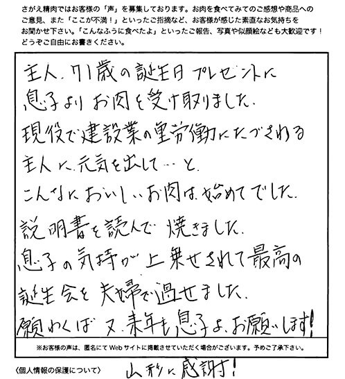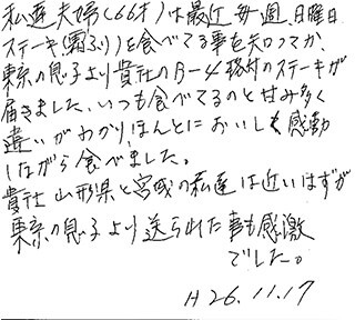 主人、71歳の誕生日プレゼントに息子よりお肉を受け取りました。現役で建設業の重労働にたづさわる主人に元気をだして、、、とこんなにおいしいお肉は始めてでした。説明書を読んで焼きました。息子の気持ちが上乗せされて最高の誕生会を夫婦で過ごせました。願わくば又、来年も息子よお願いします!山形に感謝!