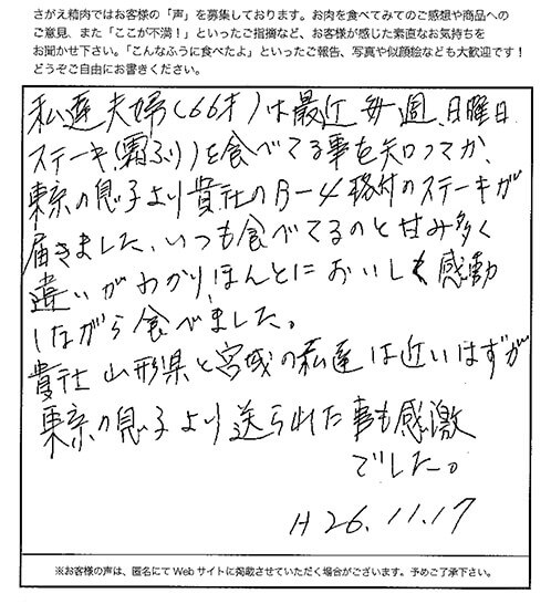 お客さまの声や口コミ・レビューをご紹介いたします。お寄せいただいた温かいお言葉を励みに、もっと、もっと、ご満足いただけるお肉をご提供できるよう努めてまいります。