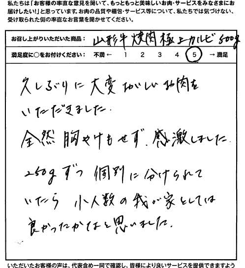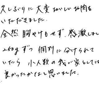 久しぶりに大変おいしいお肉をいただきました。全然胸やけもせず、感激しました。250gずつ個別に分けられていたら少人数の我が家としては良かったかなと思いました。