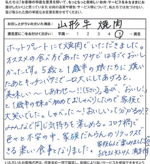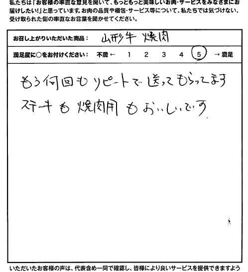 5月に娘からのプレゼントで米沢牛のステーキを送っていただきましたが、初めて食べる美味しさでした。くわしいレシピが付いていたので、上手に焼けて、本当に美味しかったです。そして今回は、焼肉を送っていただきました。柔らかく、しっかりとした牛肉の味がたまりませんでした。私は山形牛、主人は米沢牛がいいと言いながらいただきました。本当においしかったです。