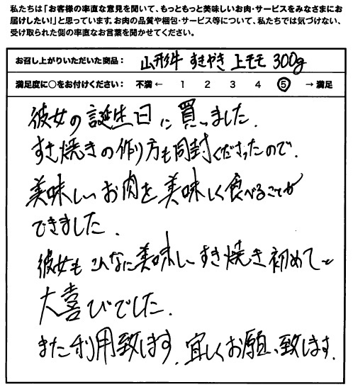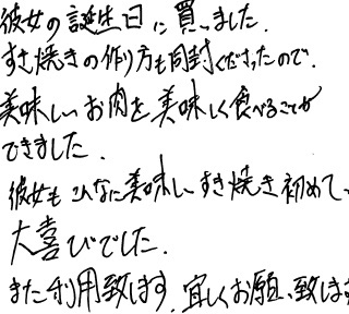 彼女の誕生日に買いました。すき焼きの作り方も同封くださったのでおいしいお肉を美味しく食べることができました。彼女もこんなにおいしいすき焼き初めてと大喜びでした。また利用いたします。よろしくお願いいたします。