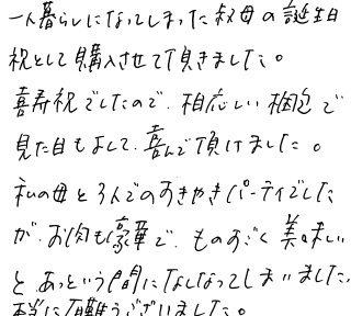 一人暮らしになってしまった叔母の誕生日祝いとして購入させていただきました。喜寿祝いでしたので、ふさわしい梱包で見た目もよくて喜んでいただけました。私の母と三人でのすき焼きパーティーでしたが、お肉も豪華で、ものすごく美味しいとあっという間になくなってしまいました。本当にありがとうございました。