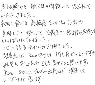 息子夫婦から誕生日のお祝いにプレゼントしていただきました。初めて食べる高級感たっぷりのお肉で美味しさと嬉しさと大満足で感謝の気持ちでいっぱいになりました。心に残る味わいのお肉でした。改善点が私の中では何もなかったのですが 梱包もおしゃれでよかったと思います。私も知人にプレゼント出来れば、満足していただけると思います。
