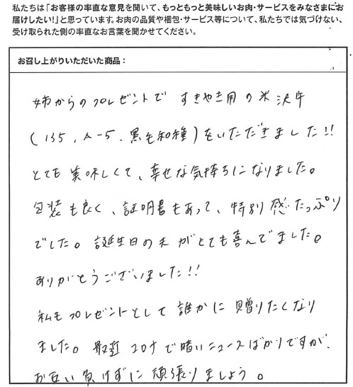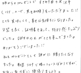 姉からのプレゼントですき焼き用の米沢牛をいただきました!!とても美味しくて、幸せな気持ちになりました。包装もよく、証明書もあって、特別感たっぷりでした。誕生日の夫がとても喜んでました。ありがとうございました!!私もプレゼントとして誰かに送りたくなりました。最近コロナで暗いニュースばかりですが、お互い負けずに頑張りましょう。