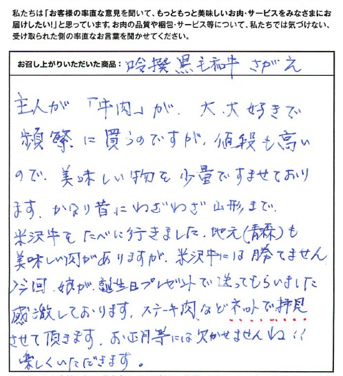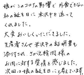 娘がコロナの影響で外食できない私の誕生日に米沢牛を送ってくれました。大変美味しくいただきました。生産者さんや米沢牛の証明書も添付され、さがえ精肉様のお肉に対する愛情を感じました。次回は娘の誕生日にと考えています。