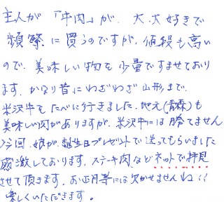 お客さまの声や口コミ・レビューをご紹介いたします。お寄せいただいた温かいお言葉を励みに、もっと、もっと、ご満足いただけるお肉をご提供できるよう努めてまいります。