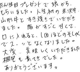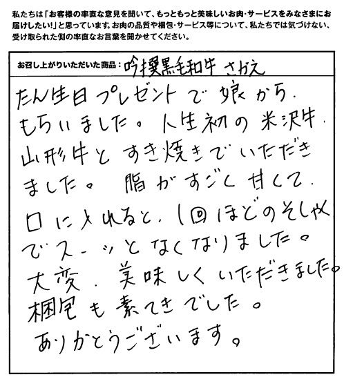 誕生日プレゼントで娘からもらいました。人生初の米沢牛山形牛とすき焼きでいただきました。脂がすごく甘くて、口に入れると一回ほどの咀嚼でスーッとなくなりました。大変美味しくいただきました。梱包も素敵でした。ありがとうございます。