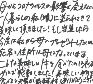 母からコロナウイルスの影響で会えない一人暮らしの私(娘)に送られてきて美味しく頂きました!もし当選したら今度は私から母へプレゼントしたいので宛名と住所は母になっています。こんな美味しい牛を食べたのは初めてで感動しました!美味しい物を食べると元気が出ますね!ありがとうございました。