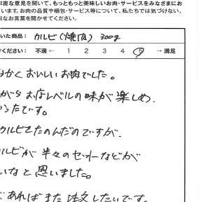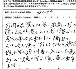 お客さまの声や口コミ・レビューをご紹介いたします。お寄せいただいた温かいお言葉を励みに、もっと、もっと、ご満足いただけるお肉をご提供できるよう努めてまいります。