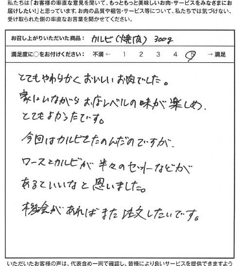 とてもやわらかくおいしいお肉でした。家にいながらお店レベルの味が楽しめ、とてもよかったです。今回はカルビをたのんだのですが、ロースとカルビが半々のセットなどがあるといいなと思いました。機会があればまた注文したいです。