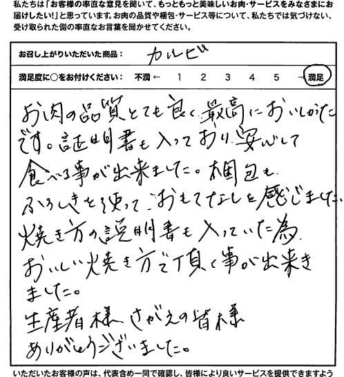 お肉の品質とても良く、最高においしかったです。証明書も入っており、安心して食べる事が出来ました。梱包も、ふろしきを使って、おもてなしを感じました。焼き方の説明書も入っていた為、おいしい焼き方で頂く事が出来きました。生産者様、さがえの皆様ありがとうございました。