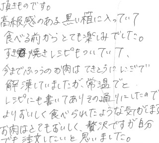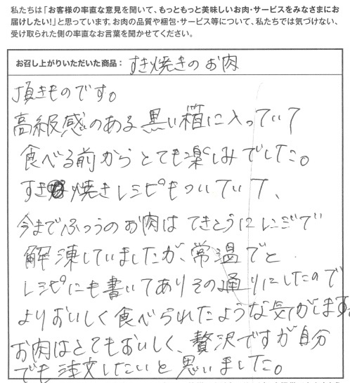 頂き物ものです。高級感のある黒い箱に入っていて、食べる前からとても楽しみでした。すき焼きのレシピがついていて、今までふつうのお肉はてきとうにレンジで解凍していましたが、常温でとレシピにも書いてあり、その通りにしたのでよりおいしく食べられたような気がします。お肉はとてもおいしく、贅沢ですが自分でも注文したいと思いました。