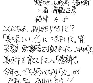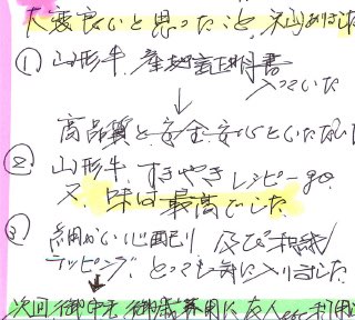 大変良いと思ったこと、沢山ありました。①山形牛、産地証明書入っていた→高品質と安全安心といただいた②山形牛、すきやきレシピ、味は最高でした③細かい心配り、及び和紙ラッピング、とっても気に入りました。次回、お中元、お歳暮用に友人etc利用したい。
