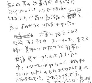 主人の昔の仕事仲間の方からのおくり物としていただきました。とても敷居が高い高級品のお肉と思い、ありがたくいただきました。大事に心をこめて出荷するまでのストーリーも、食する時に美味しいだけではなく、非常に愛情感が伝わってきました。全くクセがなく、やわらかく、山形牛がこんなに日本人の口にあうなんて思いもいたしませんでした。ごちそう様です。又ぜひいただきたく思います。