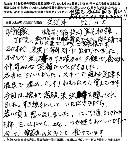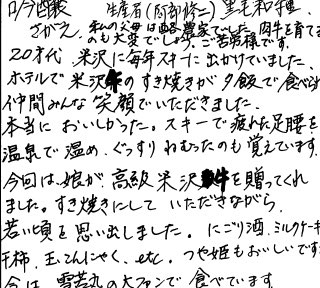 この度、機会あり米沢牛を食す事ができました。とてもおいしくいただきました。米沢牛証明書までついており、生産者の方のお名前まで…!以前、山形に旅行に行き、いただいた料理などなど、なつかしく思い出されました。ありがとうございました。