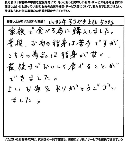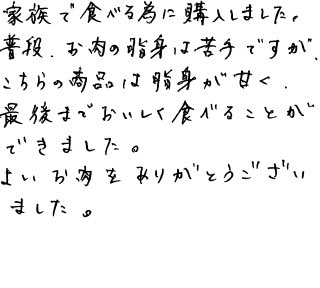 家族で食べる為に購入しました。普段、お肉の脂身は苦手ですが、こちらの商品は脂身が甘く、最後までおいしく食べることができました。よいお肉をありがとうございました。