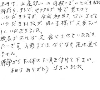 本日は、出産祝いの内祝いでいただきました。時折り、テレビやカタログ等で見させていただきますが、今回初めて口にさせていただきました。肉の王様で大変おいしくいただきました。 機会があれば又食べさせていただきたいです。山形まではなかなか足は運べません。 季節がらお体にお気をつけて下さい。 本日はありがとうございました。