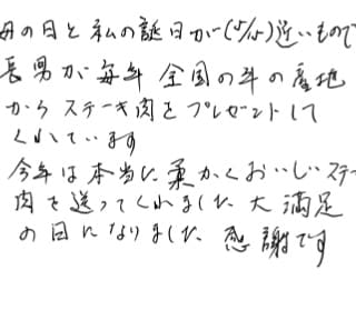 母の日と私の誕日が(5/15)近いもので長男から毎年全国の牛の産地からステーキ肉をプレゼントしてくれています 今年は本当に柔らかくおいしいステーキ肉を送ってくれました。大満足の日になりました。感謝です