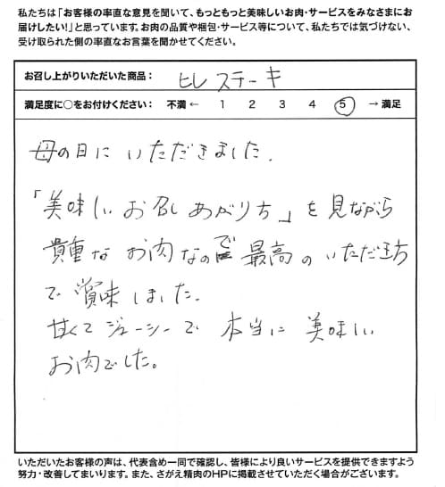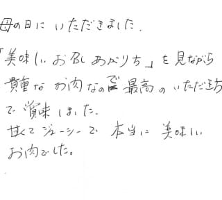 母の日にいただきました。 「美味しいお召し上がり方」を見ながら貴重なお肉なので最高のいただき方で賞味しました。 甘くてジューシーで本当に美味しいお肉でした。