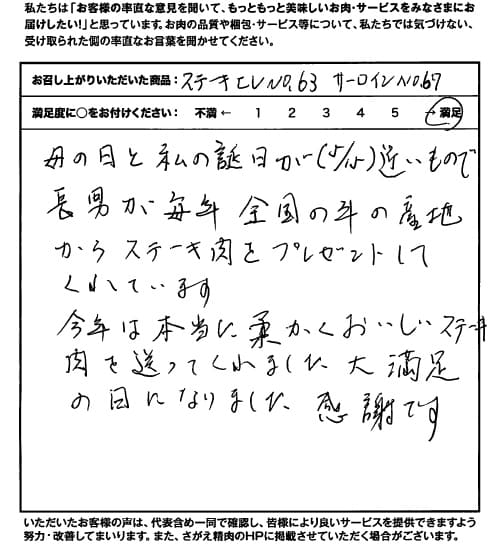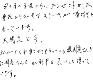 母の日の子供からのプレゼントでした。普段からお肉はステーキが一番好きと言っています。 大満足です。 私がよく利用させてもらっている焼肉屋さんもお肉屋さんも山形牛で美いしく頂いています。