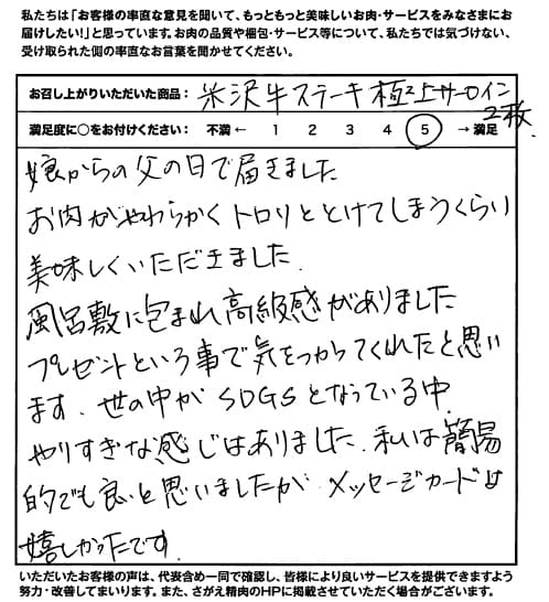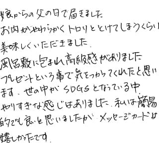 娘からの父の日で届きました。 お肉がやわらかくトロリととけてしまうくらい美味しくいただきました。 風呂敷に包まれ高級感がありました プレゼントという事で気をつかってくれたと思います。世の中がSDGsとなっている中、やりすぎな感じはありました。私は簡易的でも良いと思いましたがメッセージカードは嬉しかったです。