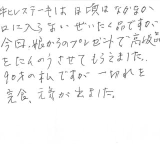 牛ヒレステーキは日頃はなかなか口に入らないぜいたく品ですが今回、娘からのプレゼントで高級品をたんのうさせてもらえました。 90才の私ですが一切れ完食、元気が出ました。