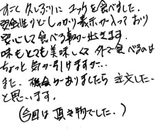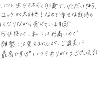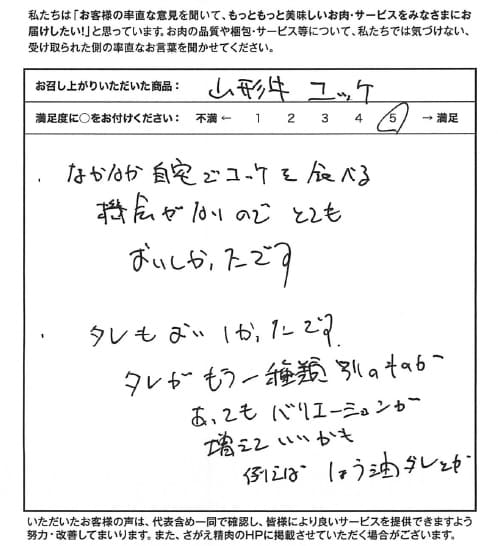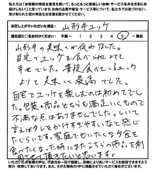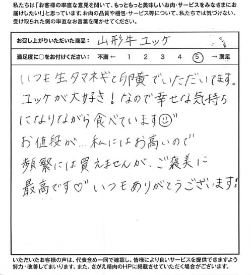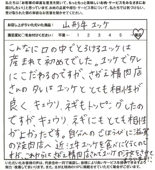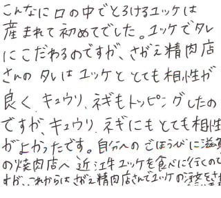 お客さまの声や口コミ・レビューをご紹介いたします。お寄せいただいた温かいお言葉を励みに、もっと、もっと、ご満足いただけるお肉をご提供できるよう努めてまいります。