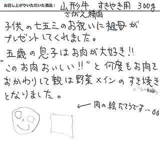 子供の七五三のお祝いに祖母がプレゼントしてくれました。五歳の息子はお肉が大好き!!"このお肉おいしい!!"と何度もお肉をおかわりして親は野菜メインのすき焼きとなりました。
