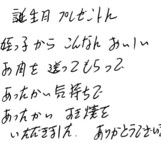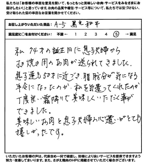私 74才の誕生日に息子夫婦からすき焼き用のお肉が送られてきました。 息子達も50才に近づき、脂肪分が気になる年令になったのか、私を気遣ってくれたのか丁度良い霜降りで美味しくいただく事ができました。 美味しいお肉と息子夫婦の心遣いがとても嬉しかったです。