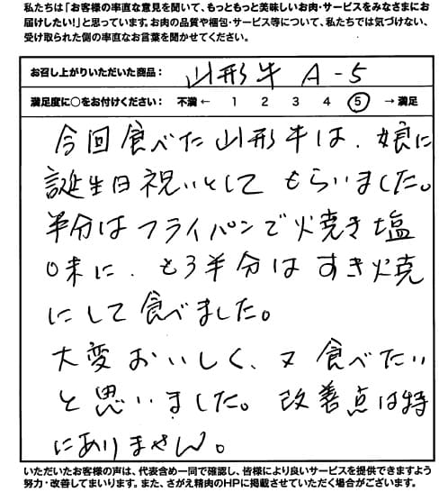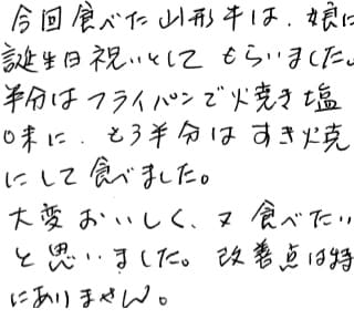 今回食べた山形牛は、娘に誕生日祝いとしてもらいました。半分はフライパンで焼き塩味に、もう半分はすき焼にして食べました。 大変おいしく、又食べたいと思いました。改善点は特にありません。
