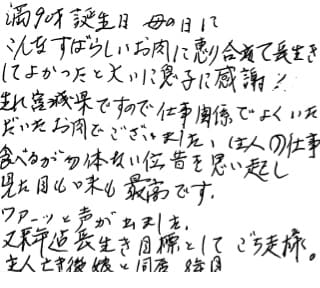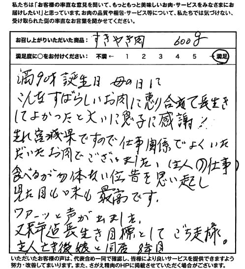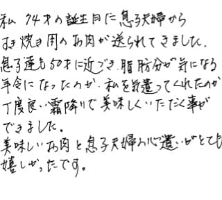満90才誕生日母の日にこんな素晴らしいお肉に巡り合って長生きしてよかったと大いに息子に感謝! 生れ宮城県ですので仕事関係でよくいただいたお肉でございました。(主人の仕事) 食べるのが勿体ない位昔を思い起し見た目も味も最高です。 ワァーッと声が出ました。 又来年迄長生き目標としてごち走様。 主人亡き後娘と同居8年目