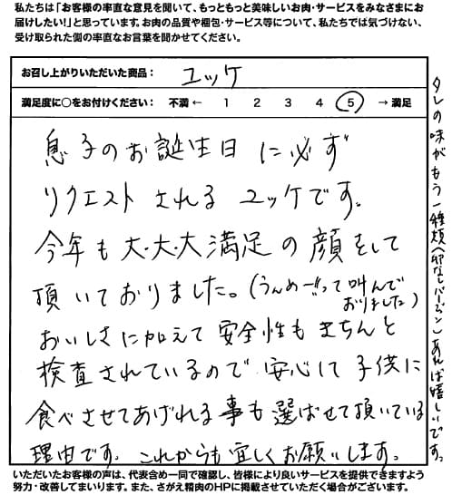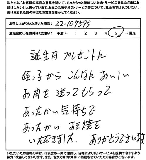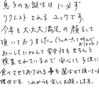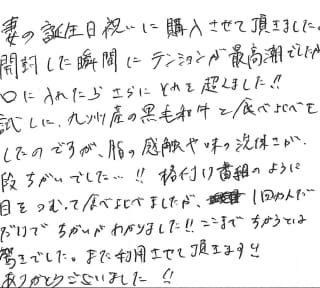 お客さまの声や口コミ・レビューをご紹介いたします。お寄せいただいた温かいお言葉を励みに、もっと、もっと、ご満足いただけるお肉をご提供できるよう努めてまいります。
