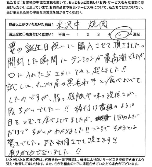 妻の誕生日祝いに購入させて頂きました。開封した瞬間にテンションが最高潮でしたが、口に入れたらさらにそれを超えました!! 試しに九州産の黒毛和牛と食べ比べをしたのですが、脂の感触や味の洗練さが段違いでした・・・!!格付け番組のように目をつむって食べ比べをしましたが、1回かんだだけでちがいがわかりました!!ここまでちがうとは驚きでした。また利用させて頂きます!! ありがとうございました!!