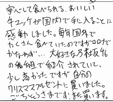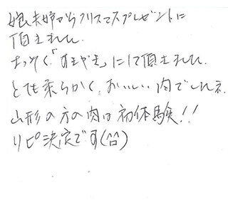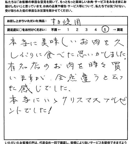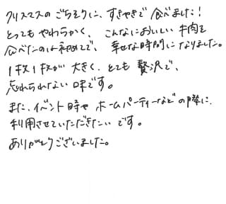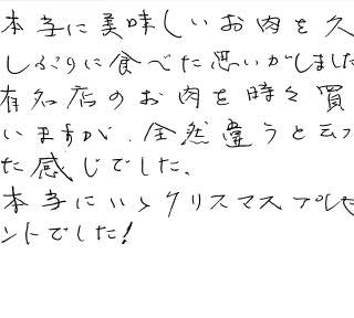 本当に美味しいお肉を久しぶりに食べた思いがしました。有名店のお肉を時々買いますが、全然違うと云った感じでした。本当にいいクリスマスプレゼントでした!