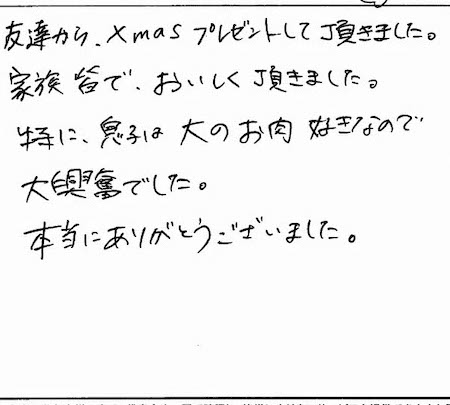 友達から、Xmasプレゼントして頂きました。家族皆でおいしく頂きました。特に息子は大のお肉好きなので大興奮でした。本当にありがとうございました。