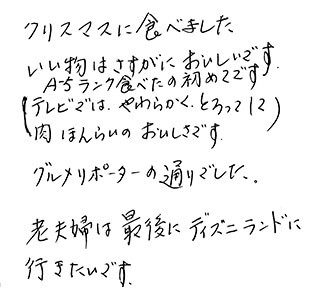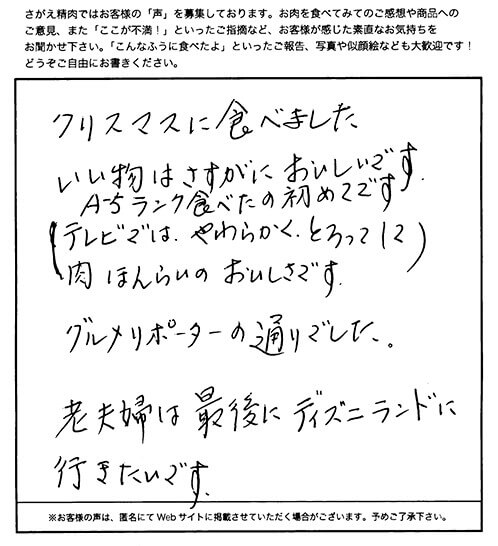 クリスマスにたべました。いい物はさすがにおいしいです。A-5ランク食べたのは初めてです。(テレビでは、柔らかく、とろっとして肉ほんらいのおいしさです。)グルメリポーターの通りでした。老夫婦は最後にディズニーランドに行きたいです。